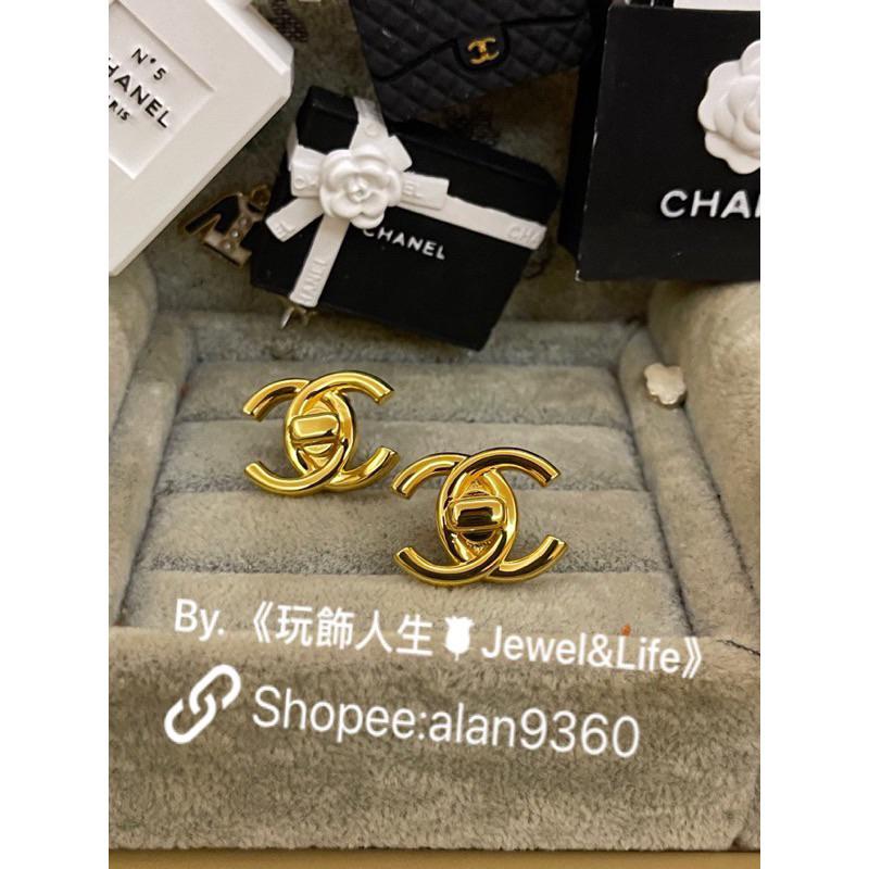 CHANEL 香奈兒 超美 金色 復古風格 大LOGO 素面 夾式 二手 書包扣 造型 耳環