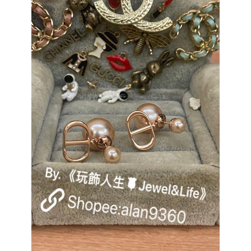DIOR 超美 玫瑰金色 金屬 CD LOGO 雙珍珠 二手 基本款 素面 造型 耳環