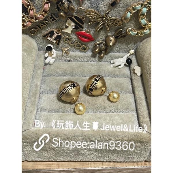 DIOR 超美 復古金 雙珍珠 黑色珐瑯 字母 二手 造型 耳環