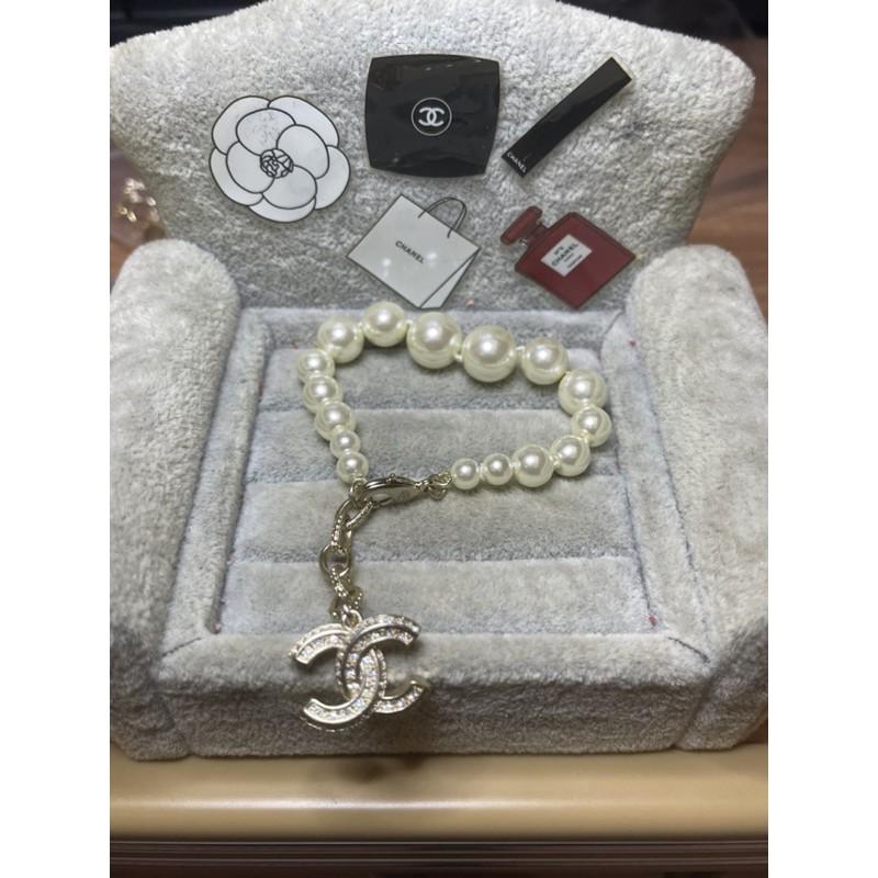 CHANEL 香奈兒 超美 氣質 大小 珍珠 淡金色 二手 水鑽 雙C 造型 手鍊