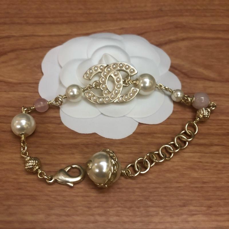 Chanel 香奈兒 粉金色 珍珠 雙C 二手 造型 手鍊