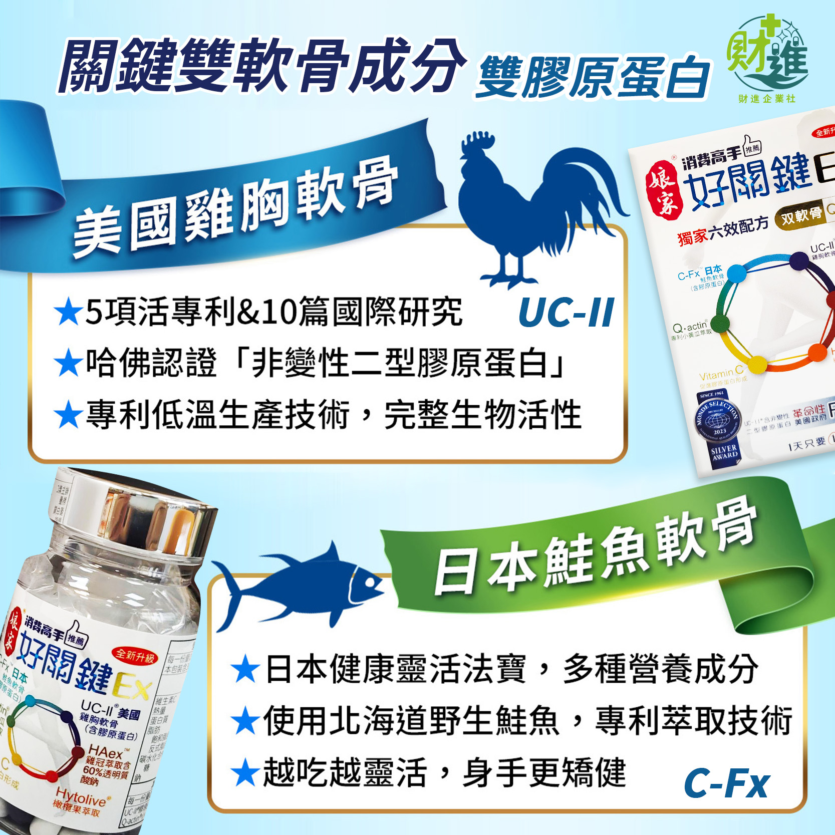 🎈雙膠原蛋白:結合美國UC-II雞胸軟骨和日本C-FX鮭魚軟骨,這兩種高品質膠原蛋白共同作用,提供更全面的營養支持。