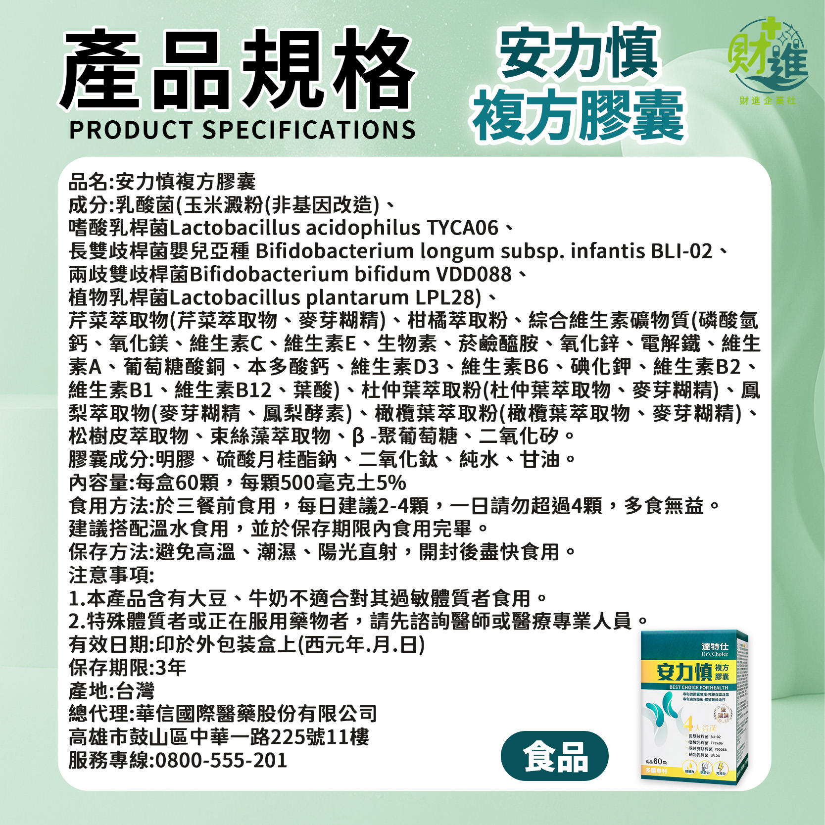 🔥內容物:乳酸菌(玉米澱粉(非基因改造)、嗜酸乳桿菌Lactobacillus acidophilus TYCA06、長雙歧桿菌嬰兒亞種 Bifidobacterium longum subsp. infantis BLI-02、兩歧雙歧桿菌Bifidobacterium bifidum VDD088、 植物乳桿菌Lactobacillus plantarum LPL28)、芹菜萃取物(芹菜萃取物、麥芽糊精)、柑橘萃取粉、綜合維生素礦物質(磷酸氫鈣、氧化鎂、維生素C、維生素E、生物素、菸鹼醯胺、氧化鋅、電解鐵、維生素A、葡萄糖酸銅、本多酸鈣、維生素D3、維生素B6、碘化鉀、維生素B2、維生素B1、維生素B12、葉酸)、杜仲葉萃取粉(杜仲葉萃取物、麥芽糊精)、鳳梨萃取物(麥芽糊精、鳳梨酵素)、橄欖葉萃取粉(橄欖葉萃取物、麥芽糊精)、松樹皮萃取物、束絲藻萃取物、β -聚葡萄糖、二氧化矽,詳細請見包裝
