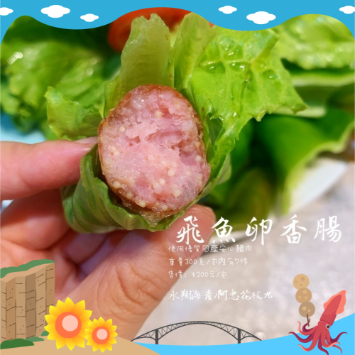 飛魚卵啵啵啵的口感在香腸裡出現使之口感有趣而意猶未盡(使用台灣豬肉)