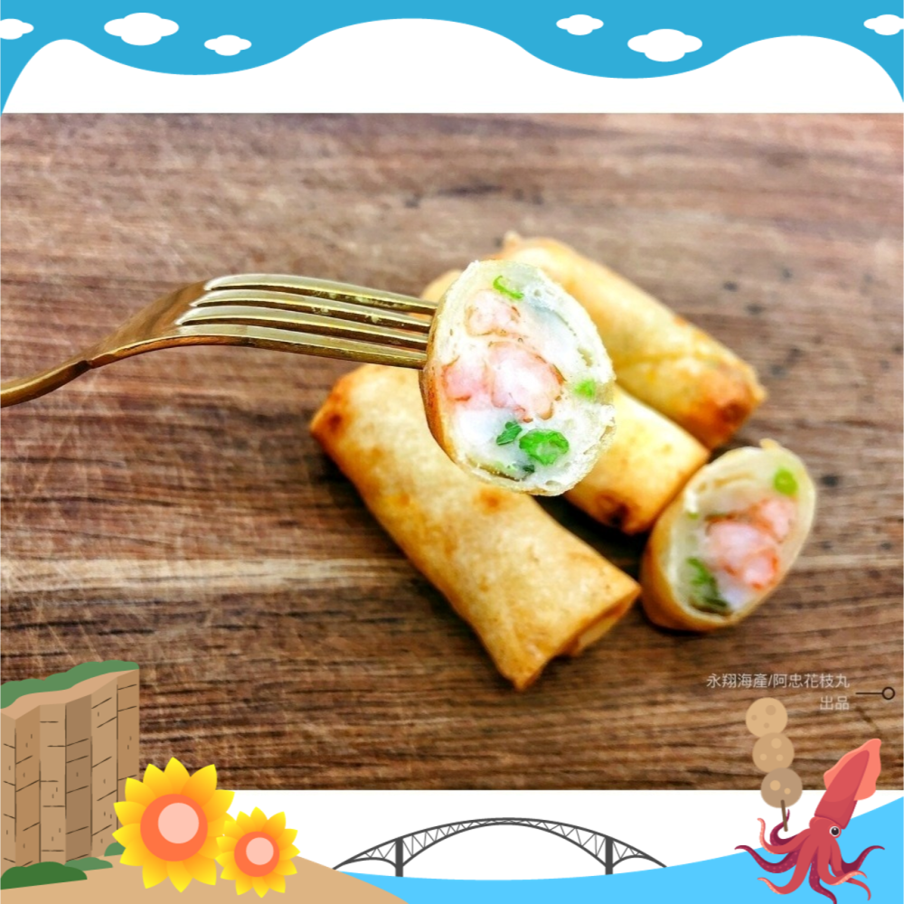 將花枝漿及鮮蝦.芹菜.青蔥調製成完美比例.利用餅皮包裹著酥炸後.口感非常鮮甜並帶著清爽好滋味