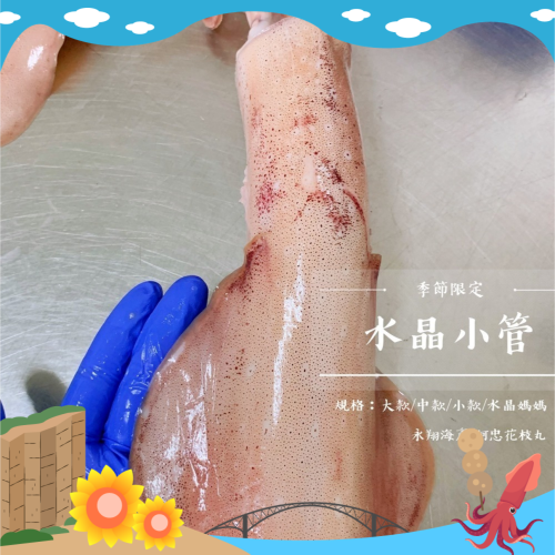 澎湖野生小管,此款特別精挑出了特大的規格,隻隻肉質飽滿結實小管經由魚船捕撈燙熟後,急速冷凍鎖住新鮮,肉質Q彈脆口、鮮甜美味;鮮甜彈牙的爆卵小管高營養低熱量的海鮮可放心大口吃