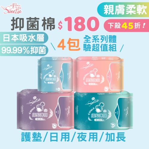 護墊 15.5cm ( 20片/包 )、日用 24.5cm ( 8片/包 )、夜用 29cm ( 7片/包 )、夜用加長 34cm ( 6片/包 )各1包