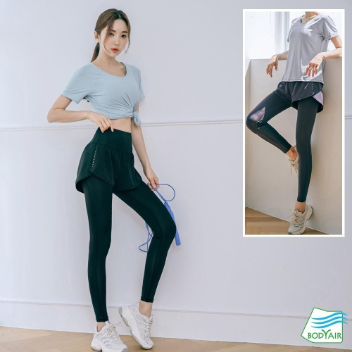 【BODYAIR】親膚S拼線上衣+假兩件柔韌九分褲套組(運動.慢跑.健身)