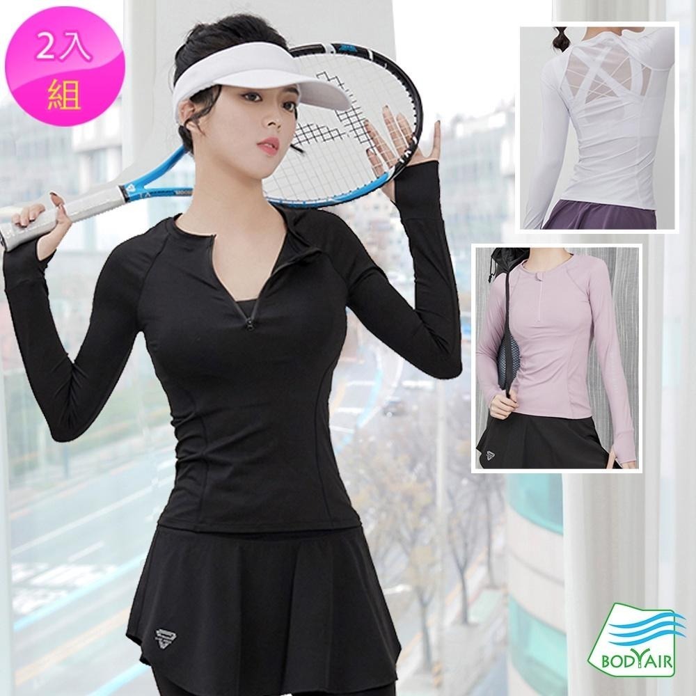 【BODYAIR】拉鍊領貼身小腰背紗長袖上衣 任2入(慢跑.運動.健身)
