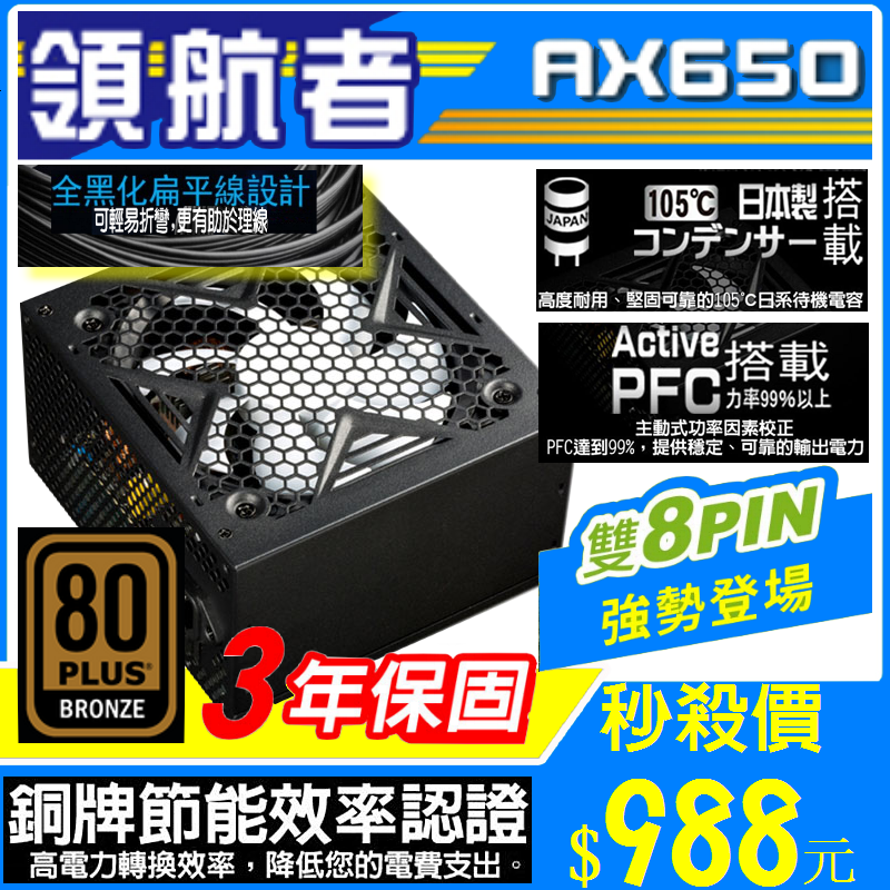 領航者 650 銅牌 電源供應器 銅牌80+ 3年保固 雙8pin 日系電容 POWER 扁線