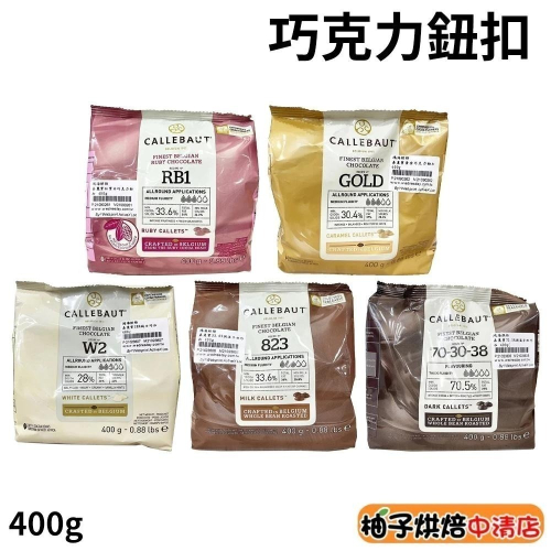 【柚子烘焙食品】比利時 嘉麗寶 巧克力鈕扣 28%純白 33.6%調溫牛奶 70.5%苦甜 紅寶石/黃金 400g 原裝