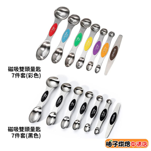 【柚子烘焙食品】磁吸雙頭量匙7件套(彩色/黑色)不銹鋼量勺 量杯套裝 烘焙調味勺 帶刻度勺 廚用雙頭量鑰 廚房用品