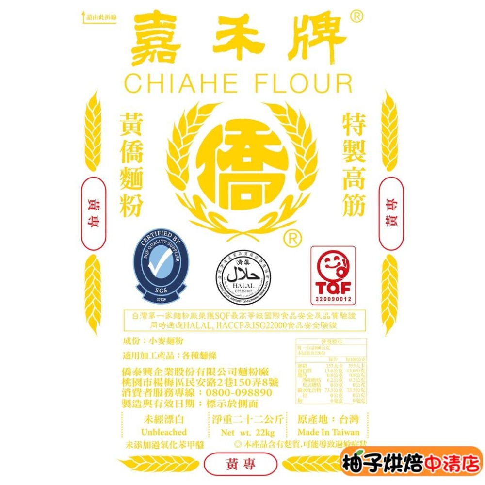 【柚子烘焙食品】嘉禾牌 黃專高筋麵粉(小麥麵粉)高筋麵粉 麵粉 黃僑高筋麵粉 特製高筋 22kg 乾麵各種麵條 烘焙材料