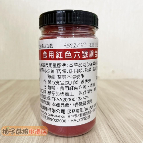 品名:食用紅色六號調和粉 使用範圍及用量標準:本產品可於各類食品中視實際需要適量使用 使用限制:生鮮(肉類、魚貝類、豆類、蔬菜、水果)、味噌、醬油、海帶、海苔、茶等不得使用 屬性:複方食品添加物-著色劑 淨重:200公克 成分:麵粉、食用紅色六號、酒精 保存期限:3年 過敏原:本產品含小麥麩質製品 原產地:台灣 *****下單請注意***** 📦 包裹規格限制: ◆超商取貨及蝦皮店到店限重五公斤以內(含包材)。 提醒您若購買1公斤的商品,超取蝦取最多只能購買四包喔! ◆7-11便利店,全家冷凍,蝦皮店到家宅配_重量限制8公斤以內 ◆蝦皮黑貓,蝦皮宅配通_重量限制18公斤以內 ◆賣家宅配常溫_重量限制25公斤內,冷藏宅配,冷凍宅配_重量限制20公斤以內(含包材) ◆花東,外島及偏遠地區 運費另計, 下單需另外下標「運費補差額」 ◆下單後若商品無缺貨1~3天內會出貨。(特殊情況除外) ◆開箱貨品時請錄影,有任何問題可以確保雙方權益!!!! ◆低溫商品、易於腐敗、保存期限較短之商品,不適用《消費者保護法》第19條的七天鑑賞期。出貨後將不受理退換貨。 🔔 任何問題歡迎 "聊聊" ◆實體店面:柚子烘焙食品 ◆營業時間:10:00~21:00 ◆周一至周日皆有營業唷~ ◆中清店 地址:台中市北區中清路一段292號 電話:04-22061810 ◆永春店 地址:台中市南屯區永春東路800號 電話:04-23825489 ◆逢甲店 地址:台中市西屯區逢甲路138號 電話:04-24520684 ◆中壢店 地址:桃園市中壢區延平路448號1樓 電話:03-42550300 ◆春日店 地址:桃園市桃園區春日路1156號 電話:03-3261910