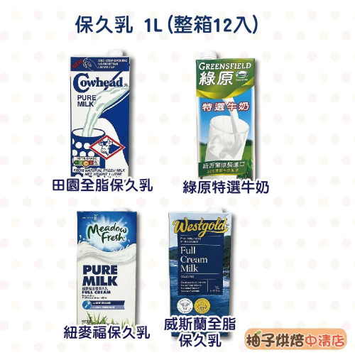 保久乳 全脂保久乳 特選牛奶 整箱購 1L*12瓶/1箱 品名:田園全脂保久乳 原料:100%澳洲生乳製造 成份:乳脂肪3.0%以上未滿3.8% 非脂肪乳固形物8.5%以上 內容量:1000毫升 保存條件:此產品經過超高溫瞬間滅菌處理, 未開封請常溫保存。 保存期限:保存12個月,開封後請冷藏於4度C以下, 並於5日內飲用完畢。 過敏原資料:本產品含有牛奶 原產國:澳洲(Australia)超高溫瞬間滅菌牛乳 ------------------------------------------------------------------------------------------- 品名:綠原特選牛奶 產地:紐西蘭 原料:100%生乳 保存條件:未開封前請置於低溫陰涼乾燥地區 開封後請置於冰箱冷藏(請於四日內使用完畢)以保新鮮 保存期限:12個月 --------------------------------------------------------------------------------------------- 品名:紐麥福保久乳 成份:100%生牛乳 過敏原標示:本產品含有食品過敏原:牛乳 *本產品不適合1歳以下孩童飲用 原產國:紐西蘭 --------------------------------------------------------------------------------------------- 品名:Westgold全脂保久乳 容量:1公升 經巴氏消毒。 成份:牛奶。含有牛奶。 儲藏說明:未開封的Westgold全脂牛奶可於室溫下保鮮至包裝 上的最佳食用期限為止。開封後請冷藏,最好在7天內使用完畢。 請勿冷凍。 保存期限:一年 產地:紐西蘭 *****下單請注意***** 📦 包裹規格限制: ◆蝦皮店到店、超商取貨限重五公斤以內(含包材)。提醒您若購買1公斤的商品,超取最多只能購買四包喔!(盡量壓在4公斤較保險) ◆大榮貨運重量限制20公斤以內(含包材、冷藏/冷凍/超大型貨運皆同) ◆黑貓宅配台灣本島限重19公斤內,外島限重14公斤內。 ◆花東,外島及偏遠地區 運費另計, 下單需另外下標「運費補差額」 ◆開箱貨品時請錄影,有任何問題可以確保雙方權益!!!! ◆低溫商品、易於腐敗、保存期限較短之商品,不適用《消費者保護法》第19條的七天鑑賞期。出貨後將不受理退換貨。~ 🔔 任何問題歡迎 "聊聊" ◆實體店面:柚子烘焙 ◆營業時間:10:00~21:00 ◆周一至周日皆有營業唷~ ◆逢甲店 地址:台中市西屯區逢甲路138號 電話:04-24520684 ◆中清店 地址:台中市北區中清路一段292號 電話:04-22061810 ◆永春店 地址:台中市南屯區永春東路800號 電話:04-23825489 ◆中壢店 地址:桃園市中壢區延平路448號1樓 電話:03-42550300