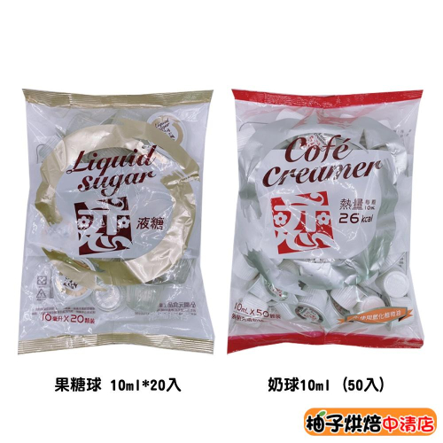 戀。果糖球 10ml*20入/包 規格:10ml*20入 保存方式:常溫1年 成分取自蔗糖,無添加防腐劑及其他添加物,品質純良 使用時可直接加入冷熱飲中,不須溶解,便利小杯裝 適合沖調咖啡、紅茶、牛奶、果汁等各式飲品 亦可用於水果、鬆餅等烘焙甜點之沾食。 戀。奶球10ml (50入) 規  格:5ml*50入/包,10ml*20入/包,10ml*50入/包 保存方式:常溫保存6個月 戀奶精球採超高溫瞬間滅菌、無菌充填包裝、無添加防腐劑 可以常溫保存,方便攜帶及使用,為台灣奶精球第一領導品牌。 戀奶精球不使用氫化植物油,經檢驗未檢出反式脂肪 濃郁香醇的經典風味,最適合搭配深度烘焙咖啡,把苦澀變為甘美。 亦適合搭配紅茶、烏龍茶及各式甜點,散發濃郁奶香味,襯托出溫厚口感。 10ml每顆熱量只有26大卡,僅佔成人每日熱量建議攝取量的1.3%,享受美味無負擔! *****下單請注意***** 📦 包裹規格限制: ◆超商取貨及蝦皮店到店限重五公斤以內(含包材)。 提醒您若購買1公斤的商品,超取蝦取最多只能購買四包喔! ◆下單後若商品無缺貨1~3天內會出貨。(特殊情況除外) ◆賣家宅配常溫_重量限制25公斤內,冷藏宅配,冷凍宅配_重量限制20公斤以內(含包材)~ ◆花東,外島及偏遠地區 運費另計, 下單需另外下標「運費補差額」 ◆開箱貨品時請錄影,有任何問題可以確保雙方權益!!!! ◆低溫商品、易於腐敗、保存期限較短之商品,不適用《消費者保護法》第19條的七天鑑賞期。出貨後將不受理退換貨。 🔔 任何問題歡迎 "聊聊" ◆實體店面:柚子烘焙 ◆營業時間:10:00~21:00 ◆周一至周日皆有營業唷~ ~ ◆逢甲店 地址:台中市西屯區逢甲路138號 電話:04-24520684 ◆中清店 地址:台中市北區中清路一段292號 電話:04-22061810 ◆永春店 地址:台中市南屯區永春東路800號 電話:04-23825489 ◆中壢店 地址:桃園市中壢區延平路448號1樓 電話:03-42550300 ◆春日店 地址:桃園市桃園區春日路1156號 電話:03-3261910