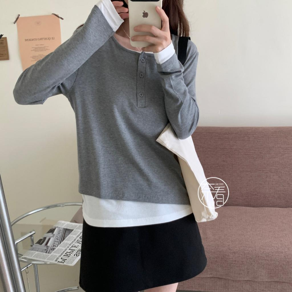 奈看服飾/春秋款 95%棉寬鬆版正肩袖 高克重 韓風假二件鈕扣可開 长袖 秋款 打底/单穿
