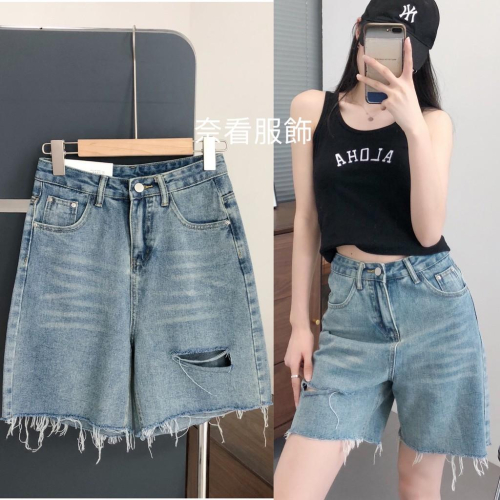 奈看實拍/高級霜藍色 舒服98%棉 顯腿膝上牛仔短褲 毛邊褲腳牛仔褲