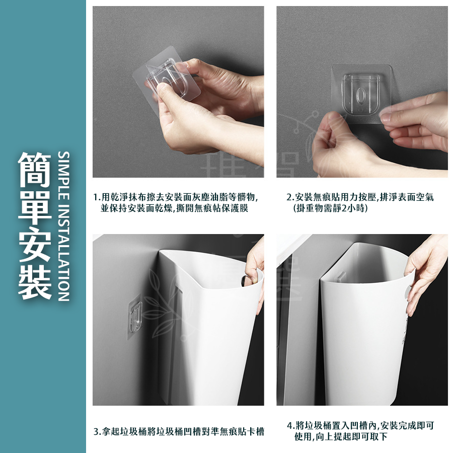 🛠️ 易於安裝的掛式設計 - 附贈的無痕貼讓您可以輕鬆將掛式垃圾桶安裝在任何您需要的地方,如廚房、浴室或辦公室,不佔用地面空間,保持地面整潔。