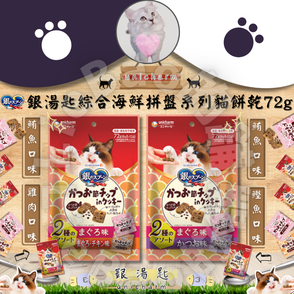 🧀日本 銀湯匙 unicharm 綜合海鮮2種拼盤口味系列 貓餅乾克 72g 🧀