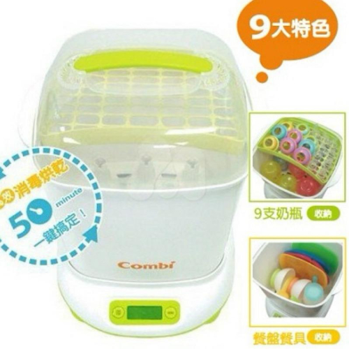 多少有使用痕跡喔 小寶寶的餵奶間隔,平均是每二~三個小時一次,頻繁的清洗程序也需要注重消毒衛生。 新式方形超大空間的Combi微電腦高效消毒鍋,一次可容網各式哺乳瓶9支,空間運用不注費,獨特氣漩式渦流動力設計,消毒+烘乾,一次搞定只要47分鐘 (高效7分鐘消毒 + 40分鐘渦旋烘乾),大大提高時效,就算是新手爸媽也可以輕鬆上手,讓育兒生活更便利喔! ★商品9大特色: 9支超大容量: 可以一次消毒9支奶瓶(瓶寬7cm以內,瓶高18cm以內),或各類適用於蒸氣消毒的家庭用品。 方形設計不浪費空間,讓空間獲得最大利用。 4項全功能滿足: 消毒+烘乾、單獨消毒、單獨40分鐘烘乾、單獨10分鐘烘乾,4種功能、多樣選擇,徹底滿足您的需求。 高效能消毒: 7分鐘以內 (依實際水量與氣溫將有所變化) 快速消毒,並經實驗室驗證能有效殺除大腸桿菌及金色葡萄球菌。 40分鐘渦流靜音烘乾: 氣漩式渦流動力設計,低音量、不吵雜,40分鐘快速達成烘乾效果。 LCD液晶顯示: LCD大尺寸狀態顯示螢幕,不論是消毒溫度或是烘乾剩餘時間,一目了然,全盤掌控。 微電腦全自動控制: 2鍵式操作按鍵(選單鍵、啟動/停止鍵),操作簡易、快速上手,烘乾消毒一次搞定。 多重安全防護: 微動開關、無水消毒斷電、30秒功能未啟動自動關閉、結束自動斷電、三重電路保護裝置等多重安全防護措施,完全符合BSMI、CCC認證規格,確保居家使用安全。 全材質FDA認證: 全機塑料材質經F.D.A.認證不含環境荷爾蒙等干擾內的化學物質,採用食品級耐高溫素材製成,耐高溫、無毒性、好清洗。 衛生收納(請另行選購Combi 奶瓶保管箱): 底座主機全密閉式防蟑設計,奶瓶置放筒附加密封底盤設計,可作為奶瓶消毒置放筒或奶瓶保管箱互換使用,讓消毒前、後奶瓶分開放置,一物二用,衛生安全,防止二次污染。