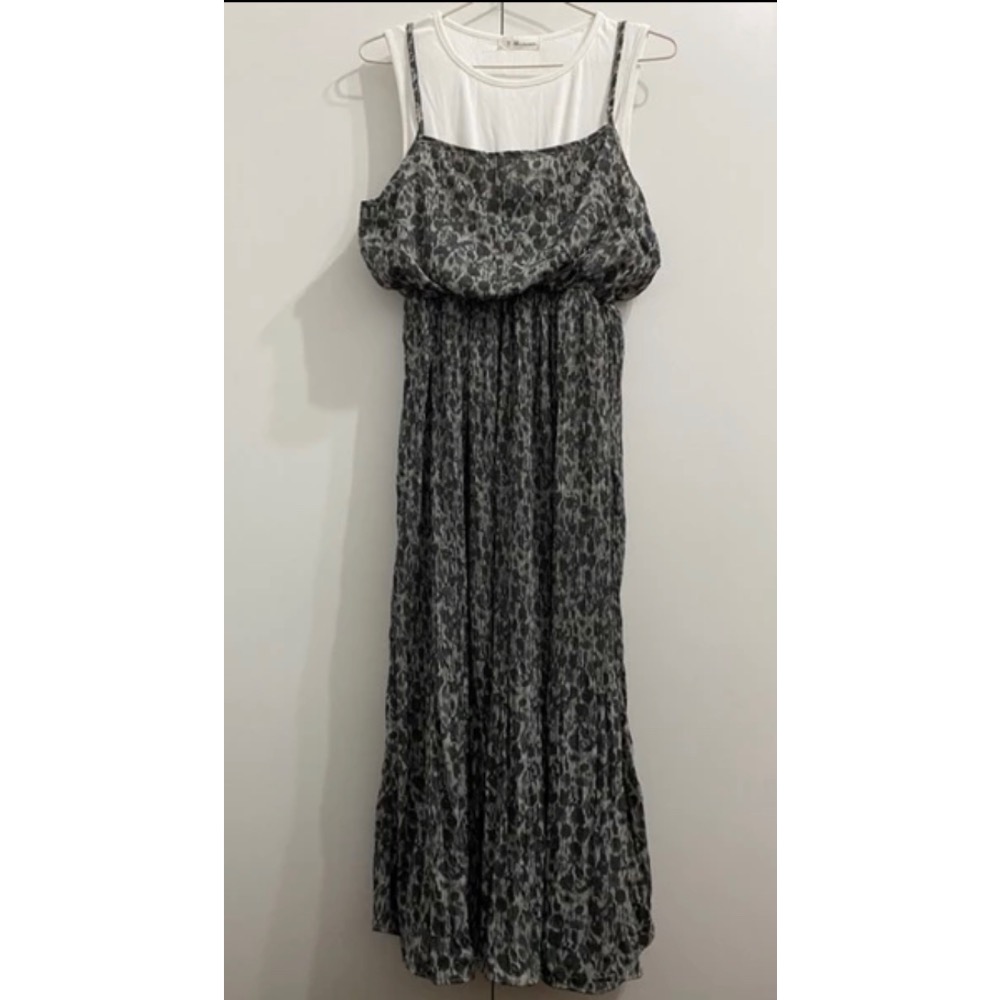 編號5 長版洋裝 洋裝 假兩件式連身 春夏款渡假風小清新飄逸假兩件壓褶長洋 長裙 連身洋裝 豹紋長版洋裝 淺咖
