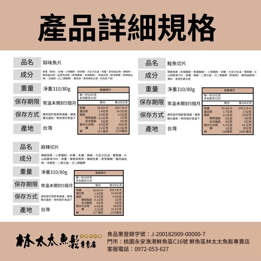 林太太一邊說著,一邊又拿起自家招牌「蒜味魚片」不斷熱情的塞到我們手裡。堅持使用一等品質的鮮魚製作,不同於市售沙茶和蜜汁口味的甜膩與高糖份,特別研發獨門調料,憑藉著入口後那唇齒蒜香與Q彈嚼勁,成功打造人手一包、無限回購的漁產商機。