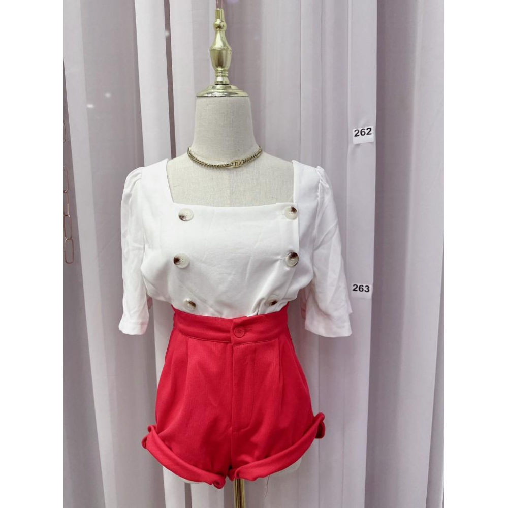 YAN台灣女裝現貨 雙排扣短袖雪紡上衣 造型 簡約 素面 彩色方塊 ootd aifei