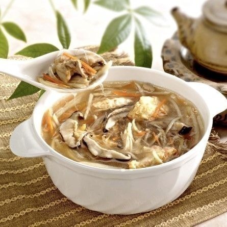 成份:水、筍絲、金針菇、素魚翅(海藻粉、海藻酸鈉)、紅蘿蔔絲、黏稠劑(乙醯化己二酸二澱粉)、香菇、芥花油、烏醋、鹽、醬油、糖、大豆油、芝麻油、白胡椒粉、調味劑(L-麩酸鈉、胺基乙酸、DL-胺基丙酸、5'-次黃嘌呤核苷磷酸二鈉、5'-鳥嘌呤核苷磷酸二鈉、琥珀酸二鈉、檸檬酸鈉、檸檬酸)麥芽糊精、芹菜抽出物、甜味劑(甘草酸一銨)