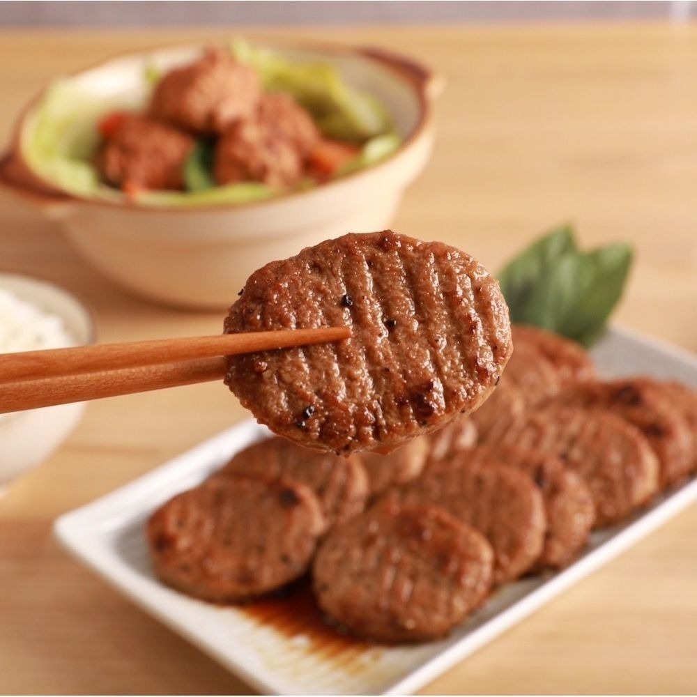 成份:水、非基因改造大豆分離蛋白、非基因改造脫脂豆粉、玉米澱粉、高筋麵粉、小麥蛋白、馬鈴薯澱粉、芥花油、蛋白粉、醬油、乳清、黏稠劑(乾酪素鈉)、麥芽糊精、糖、調味劑(L-麩酸鈉、胺基乙酸、DL-胺基丙酸、 5'-次黃嘌呤核苷磷酸二鈉、5'-鳥嘌呤核苷磷酸二鈉、琥珀酸二鈉、檸檬酸)、香料、大豆油、胡麻粉、香油、麵包粉、鉀鹽、小麥胚芽、花生粉、香辛料、肉桂、丁香、椰子粉、辣椒粉、甜味劑(甘草酸鈉)、鹽、黑胡椒粉、 酵母抽出物、著色劑(焦糖色素、食用紅色40號)。
