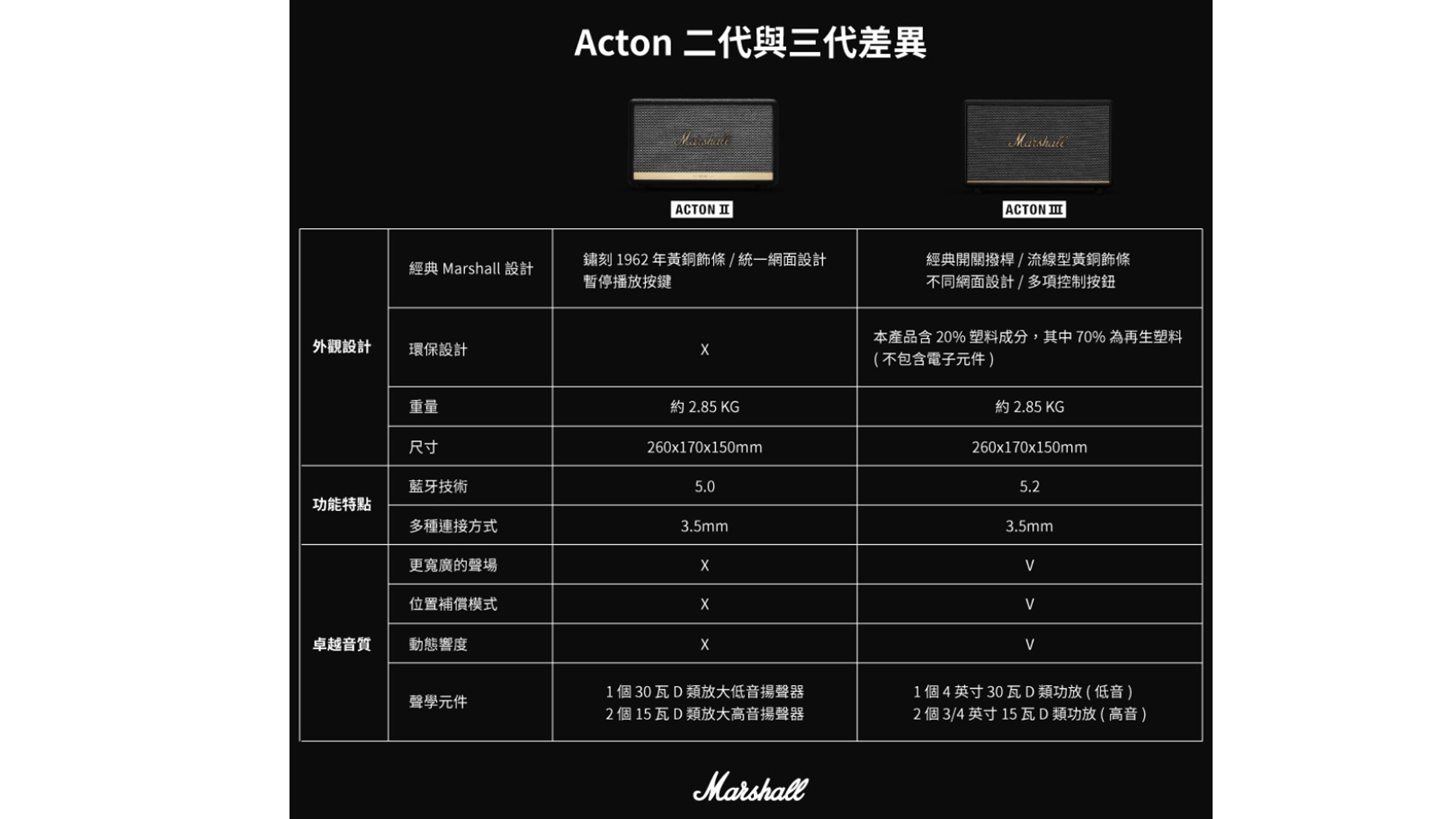 作為家用系列中外形最小巧的喇叭,ActonIII音質出眾,適用於各種場所。ActonIII擁有比其上一代更豐富的聲場,經過重新設計,充滿空間感的Marshall標誌性音效得以延續,並帶來更加身臨其境的沉浸式聆聽體驗。新一代Acton配備向外傾斜的高音單元與新版導波管,營造出始終如一的渾厚音質與寬廣聲場,讓美妙音樂如影隨形。