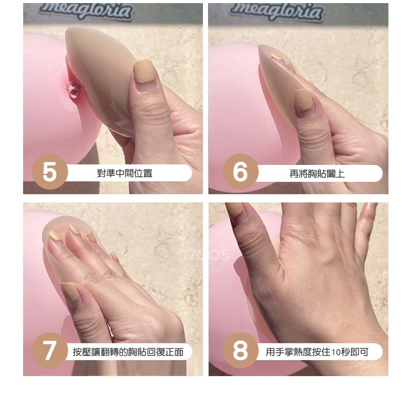 👉將胸貼置放要黏貼的皮膚上後,用手壓住使手心的溫度溫熱矽膠胸貼約10秒,即可穩固貼合。