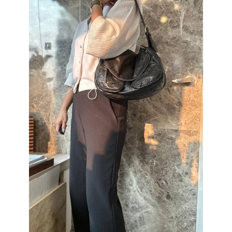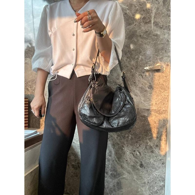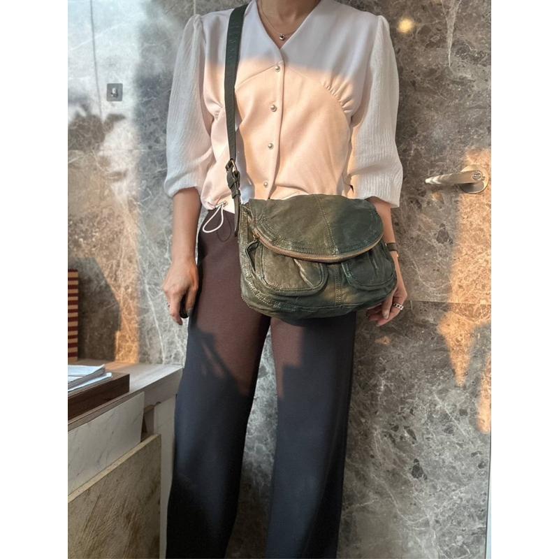 現貨【🇰🇷 Tanned】【保固】🔥|韓國 半圓拉鍊蓋子雙口袋包👜真皮系列 復古風 牛皮水洗 斜背長背包