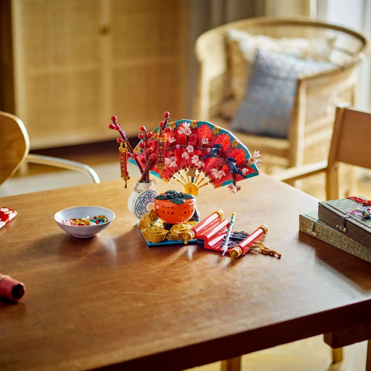 **此盒組包括有 2 隻喜鵲裝飾的扇子、裝有紅色發財果的花瓶、柿子、3 個金元寶和附卷軸的毛筆。