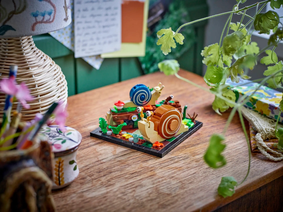 **內容包含兩隻殼上有漩渦圖案的蝸牛、施以蜜蜂印刷的 1×1 透明小圓零件、堆砌樣式的圓木、綠色的小水窪跟黏液等。