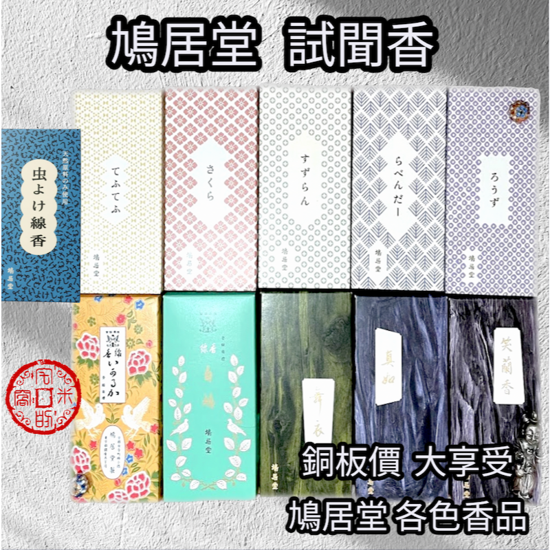 日本鳩居堂原是藥商,在以前昭和、明治時代便因自創的蛇頂石民間療法(在被蚊、蟲、蚤、蜂叮咬時,以蛇頂石浸水浸泡治療)聞名,而線香、薰香在日本常在藥品店販售,鳩居堂的香品據說是得到平安時代宮中御用香的製作秘方,並以此宮中秘方製作販賣。