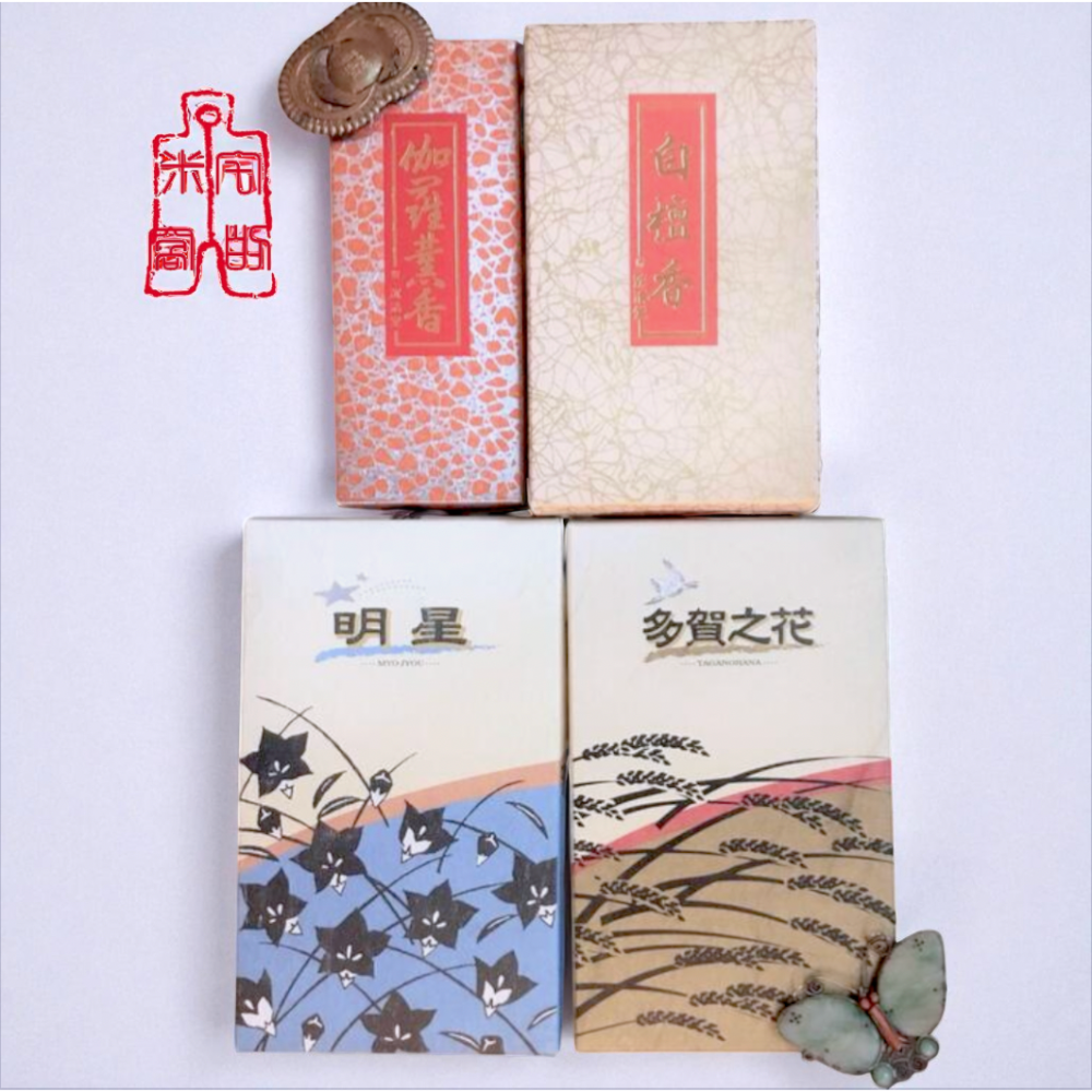 5.本賣場四種線香各兩根組(內容:伽羅薰香&白檀香&明星&多賀之花各兩根)以夾鏈袋包裝