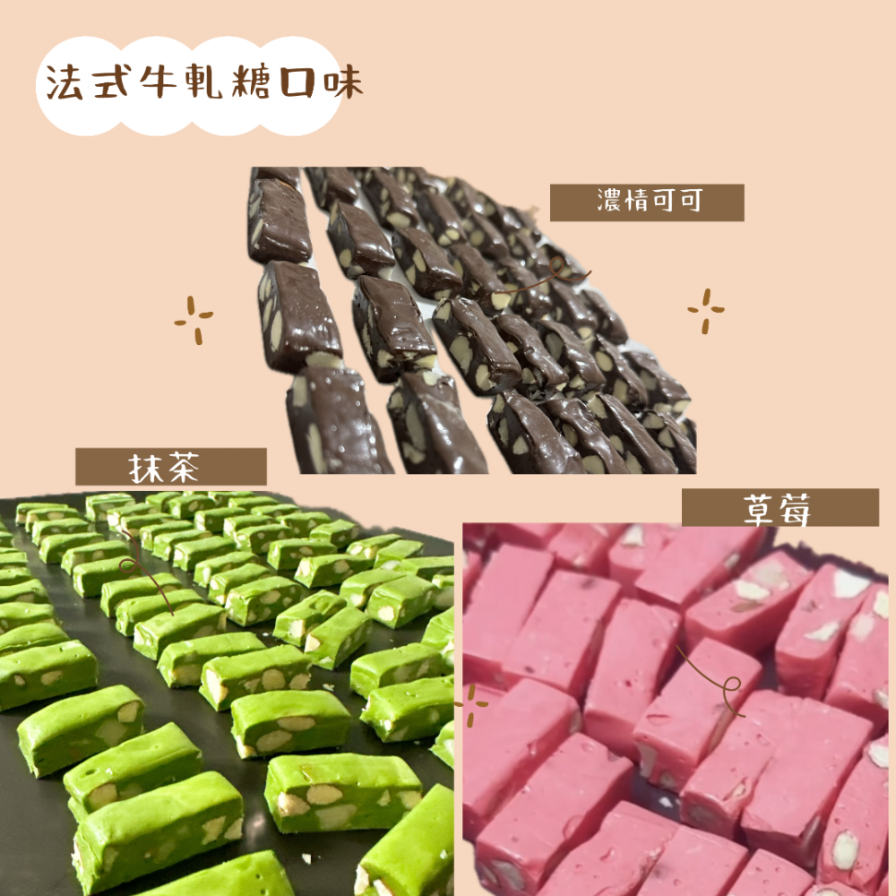 口味: 濃情可可/抹茶˙/草莓( 奶蛋素) 法式花生牛軋糖