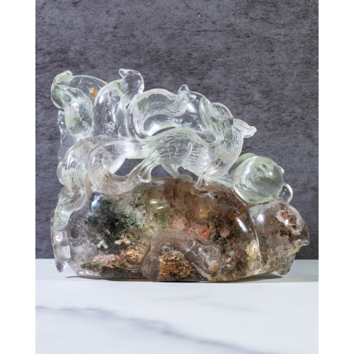 幽靈水晶,又稱異像水晶。異象水晶是指在水晶的生長過程中,可能因為地殼變動或者火山爆發等天然造地運動,使得一些礦物質或者是火山灰泥被正在形成的白水晶所包覆,不同顏色的火山泥等礦物質,在通透的白水晶里,浮現如雲霧、水草、漩渦甚至金字塔等天然異象,內包物顏色為綠色的則稱為綠幽靈水晶,同樣道理,因火山泥灰顏色的改變,也會形成紅幽靈、白幽靈、紫幽靈、灰幽靈水晶等