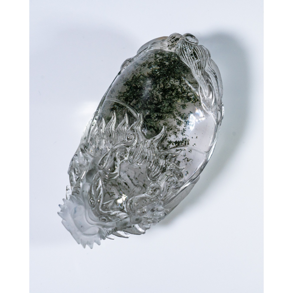 幽靈水晶,又稱異像水晶。異象水晶是指在水晶的生長過程中,可能因為地殼變動或者火山爆發等天然造地運動,使得一些礦物質或者是火山灰泥被正在形成的白水晶所包覆,不同顏色的火山泥等礦物質,在通透的白水晶里,浮現如雲霧、水草、漩渦甚至金字塔等天然異象,內包物顏色為綠色的則稱為綠幽靈水晶,同樣道理,因火山泥灰顏色的改變,也會形成紅幽靈、白幽靈、紫幽靈、灰幽靈水晶等。