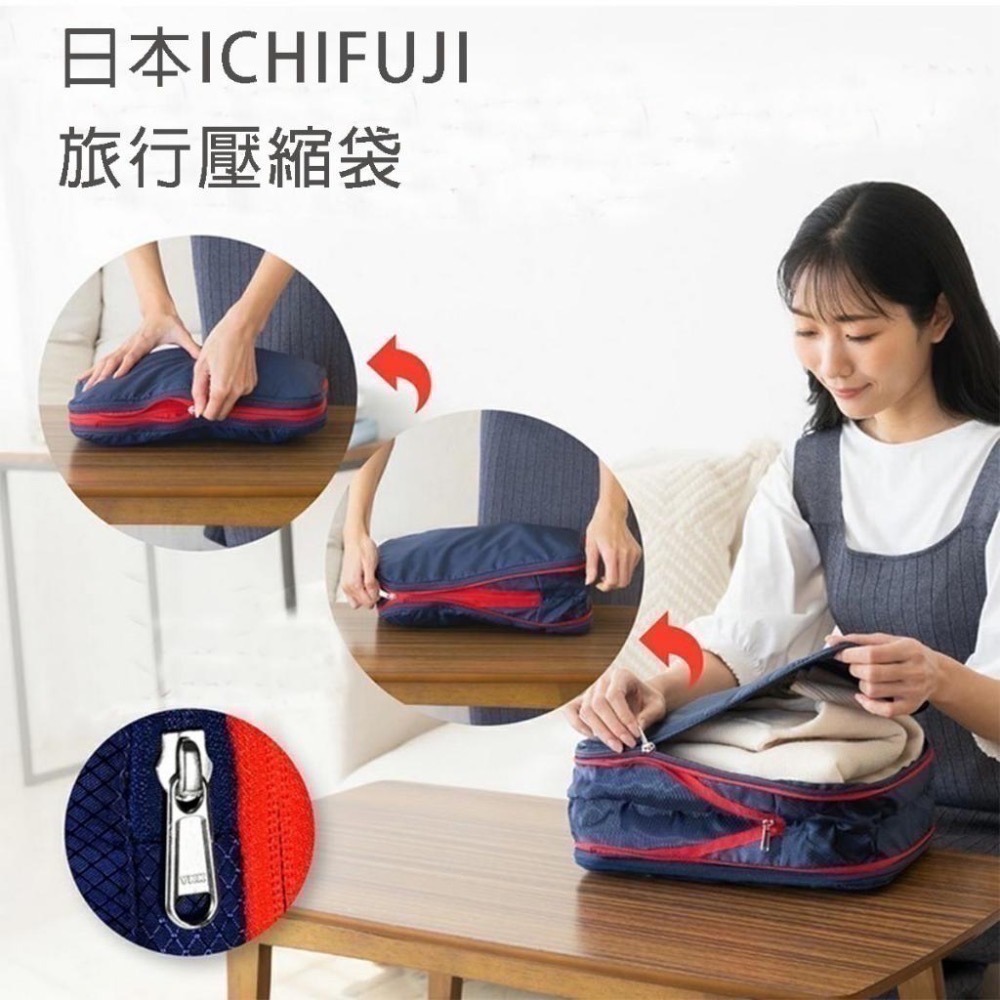 日本 ICHIFUJI 旅行 壓縮袋 商品為海軍藍 可將旅行用衣物壓縮約 50%