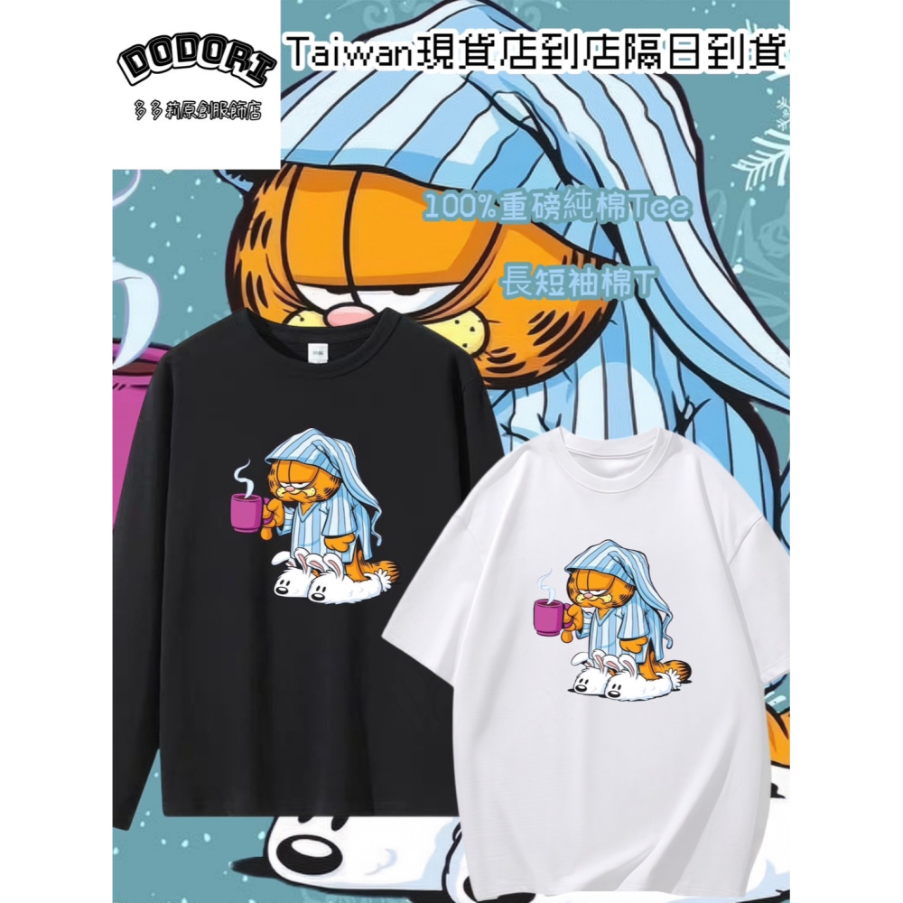 台灣現貨 100%純棉 剛起床穿兔子拖鞋喝咖啡 穿睡衣加菲貓 短袖t恤 長袖 兒童 情侶 團體 班服 大尺碼