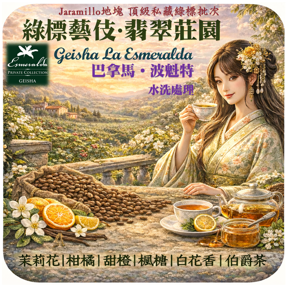 翡翠莊園的頂級系列瑰夏之一,海拔1600-1800公尺,本次到貨的批次為私藏綠標中海拔較高較晚採收的批次,讓大家一飽口福。