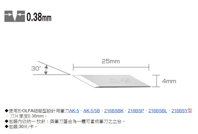 OLFA 筆刀AK-5型使用之刀片,30片/包。