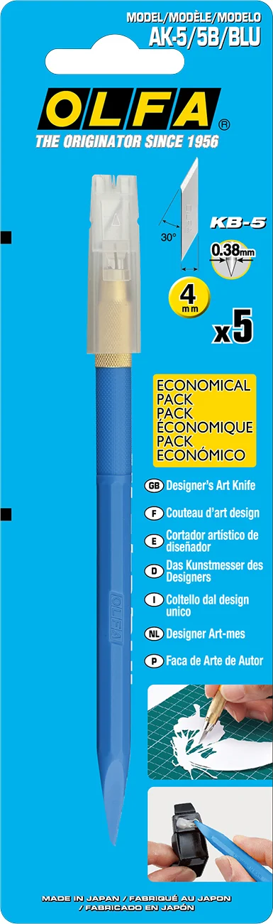 擁有30度角尖形刀片及筆狀之黑色握柄,適用於最精確之切割。本款商品附5片KB-5刀片。