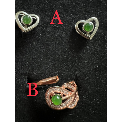名稱:和田青玉玫瑰金葉子造型戒指、心型造型耳針