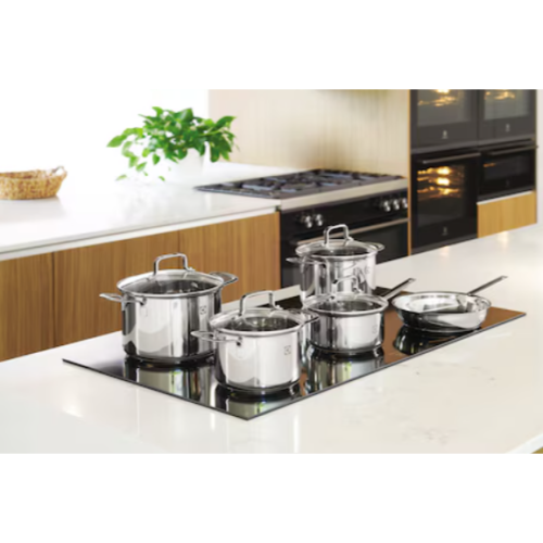 五件組優質不鏽鋼鍋具套組。 三層底座可快速均勻地加熱鍋具。 適用於所有爐灶和烤箱類型的多功能烹飪