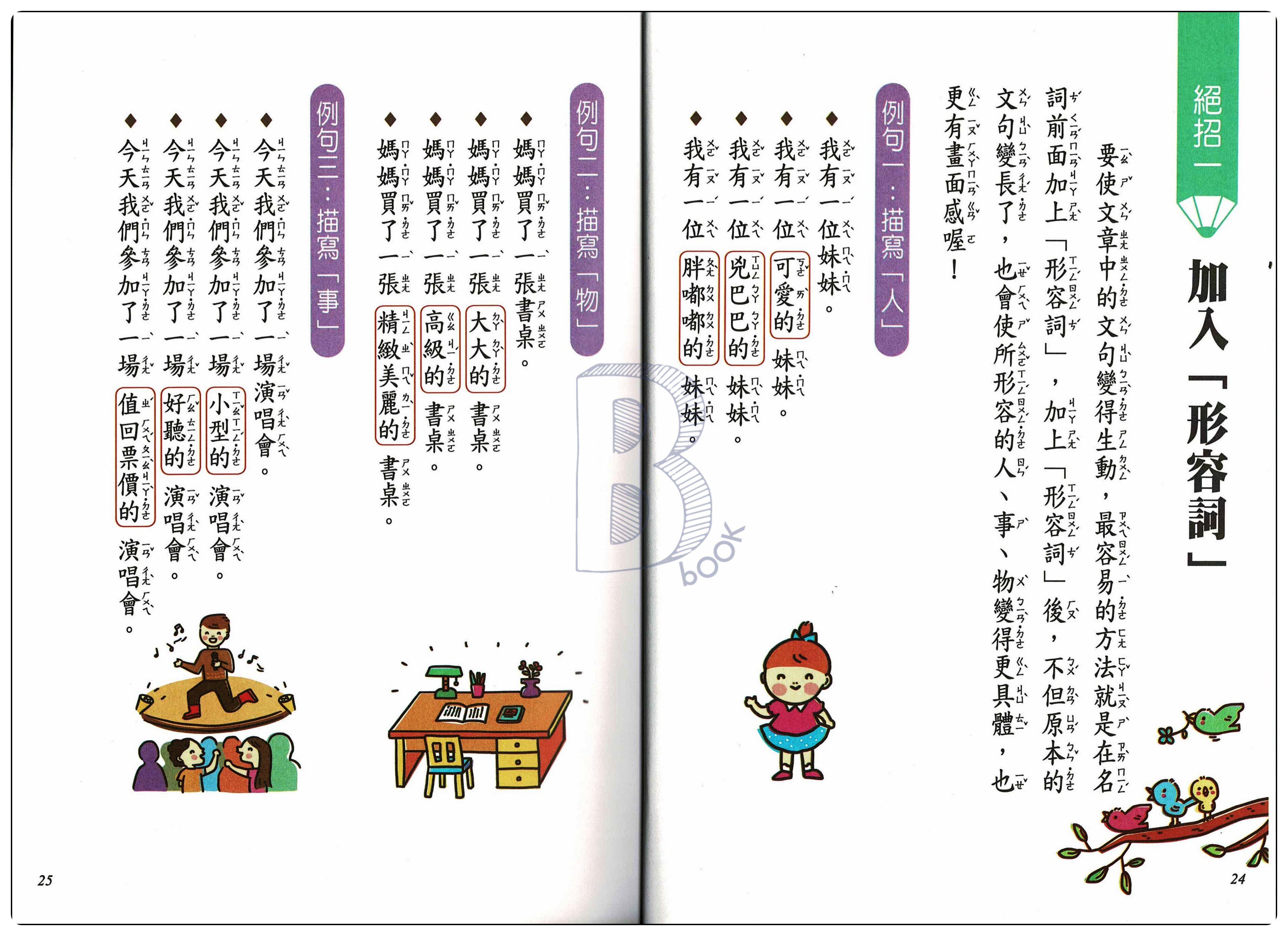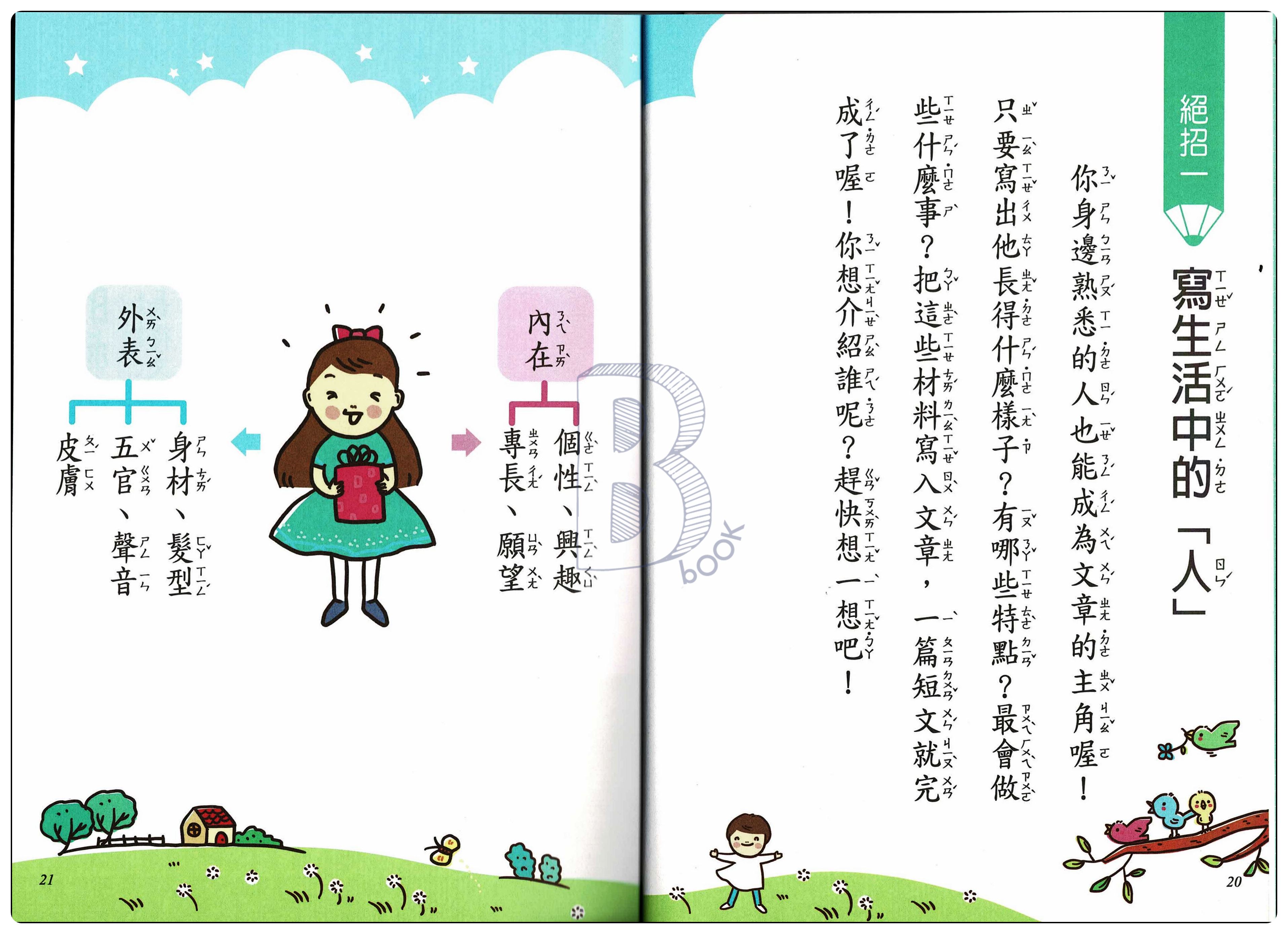 本書專為國小二年級學生設計,從練習描寫「人」、「事」、「物」開始,一步步引導二年級的學童,「動動腦」、「範文」、「段落大意說明」教孩子動動腦、想一想,從日常生活的人、事、物出發,培養小朋友的思考力及寫作力,動手練習寫出好文章。
