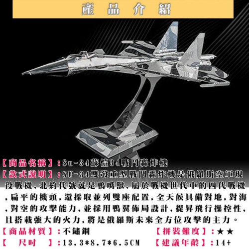 鋼鐵火星人益智玩具★ SU-34蘇愷戰鬥轟炸機 ★拼酷★MU藝模★3D立體金屬拼圖★DIY金屬模型