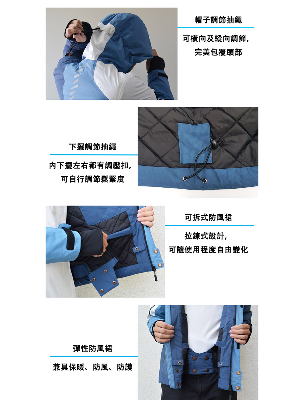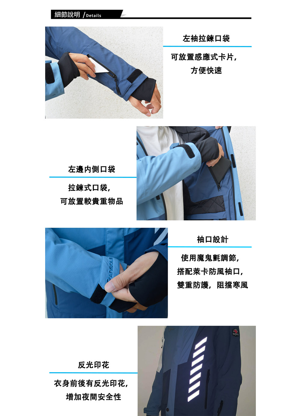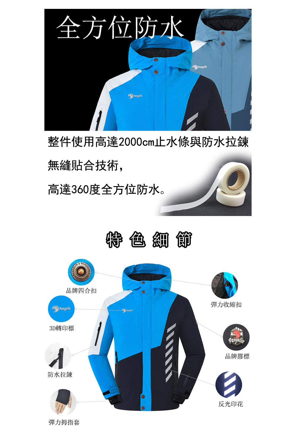 2、卓越的防水透濕機能布料,加上接縫壓膠止水帶的工藝,可達到360度全面防水作用。